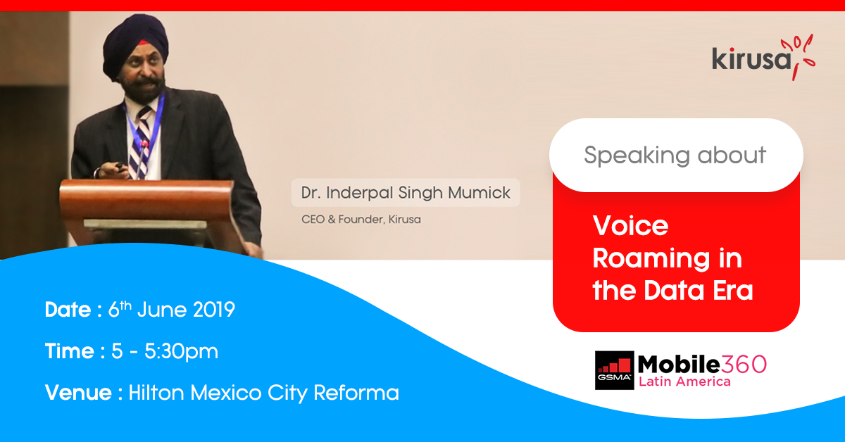GSMA's Mobile 360 Series is a conference platform that cultivates regional engagement through topics that are impacting the mobile industry on both a localised and global scale. Mobile 360 Series – Latin America which took place from 4-6 June 2019 in Mexico brought together market leaders from Latin America across the mobile ecosystem to discuss key drivers for innovation centred around topics crucial to the region. The event examined the technologies of tomorrow (5G, AI, Blockchain), the impact they will have on the industry at a regional & global level as well as the government strategies that are driving digital transformation across Latin America. Inderpal Singh Mumick, Founder, Chairman and CEO of Kirusa had the honour of speaking at the event on the topic of 'Voice Roaming in the Data Era.' Shedding light on why roaming is a huge concern for telcos, Mr. Mumick disintegrated the anatomy of silent roamers further explaining how a voice-over-data solution can help address the problem and can be a suitable solution for both, telcos and subscribers.